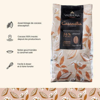 Le chocolat Caramélia 36% est un chocolat au lait gourmand et fondant, maintenant disponible en format généreux de 3kg. Issu d'un assemblage d'exception, il offre un lacté onctueux et la puissance de son goût de caramel au beurre salé, invitant à la gourmandise.
