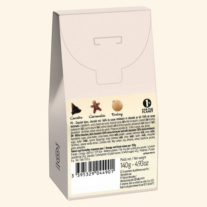 Pralinenschachtel in Form von Schneebällen, Sternen und Lebkuchenmännchen aus dunkler Schokolade Caraïbe 66 %, Milchschokolade Caramélia 36 % und Dulcey 35 %.