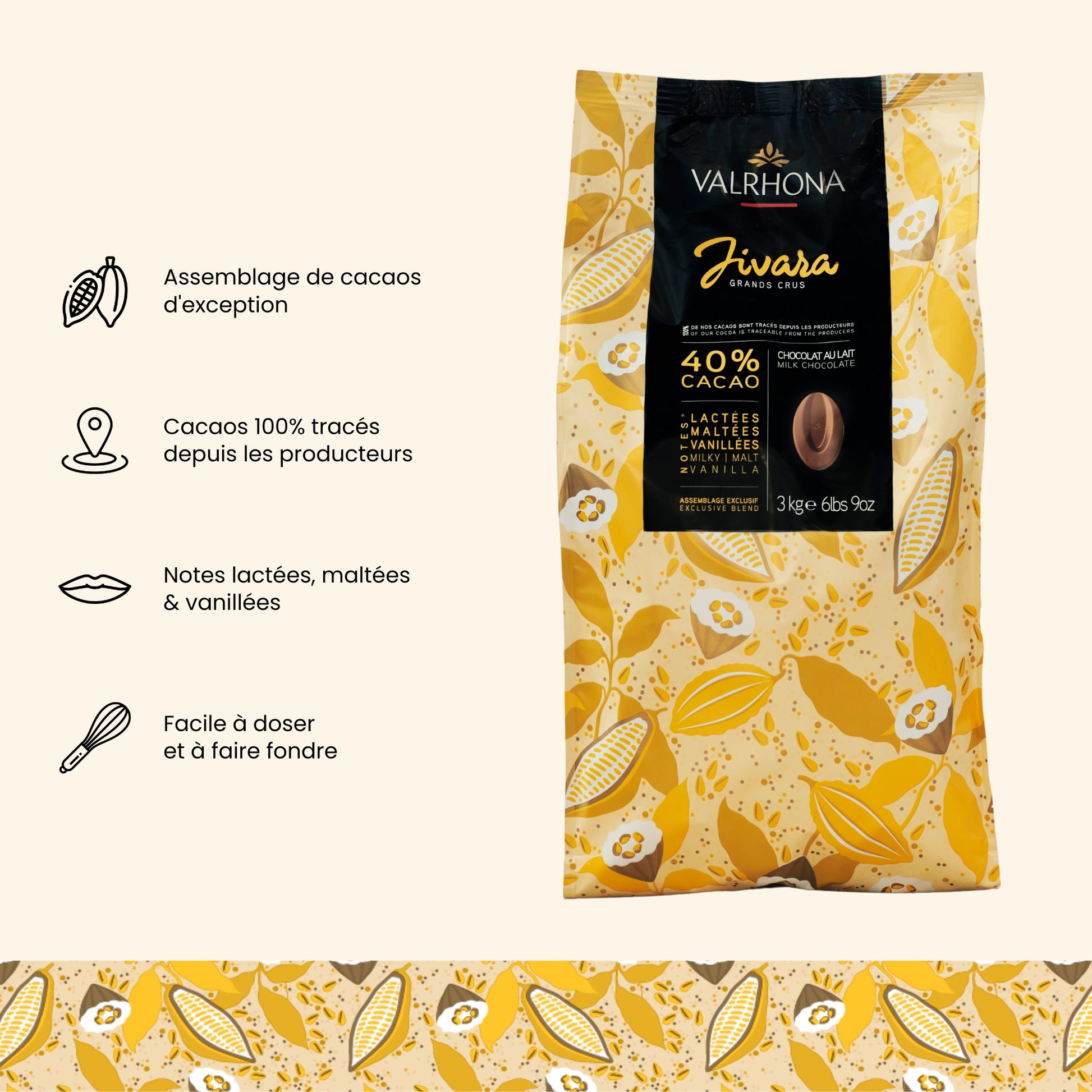 Le chocolat Jivara 40% se marie délicieusement avec les fruits secs, la fève tonka et le caramel au beurre salé. Pour plus de peps, combinez-le avec des fruits rouges acidulés ou des fruits exotiques comme le fruit de la passion ou la mangue. Pour les palais avertis, osez des associations audacieuses avec du basilic ou de la violette.
