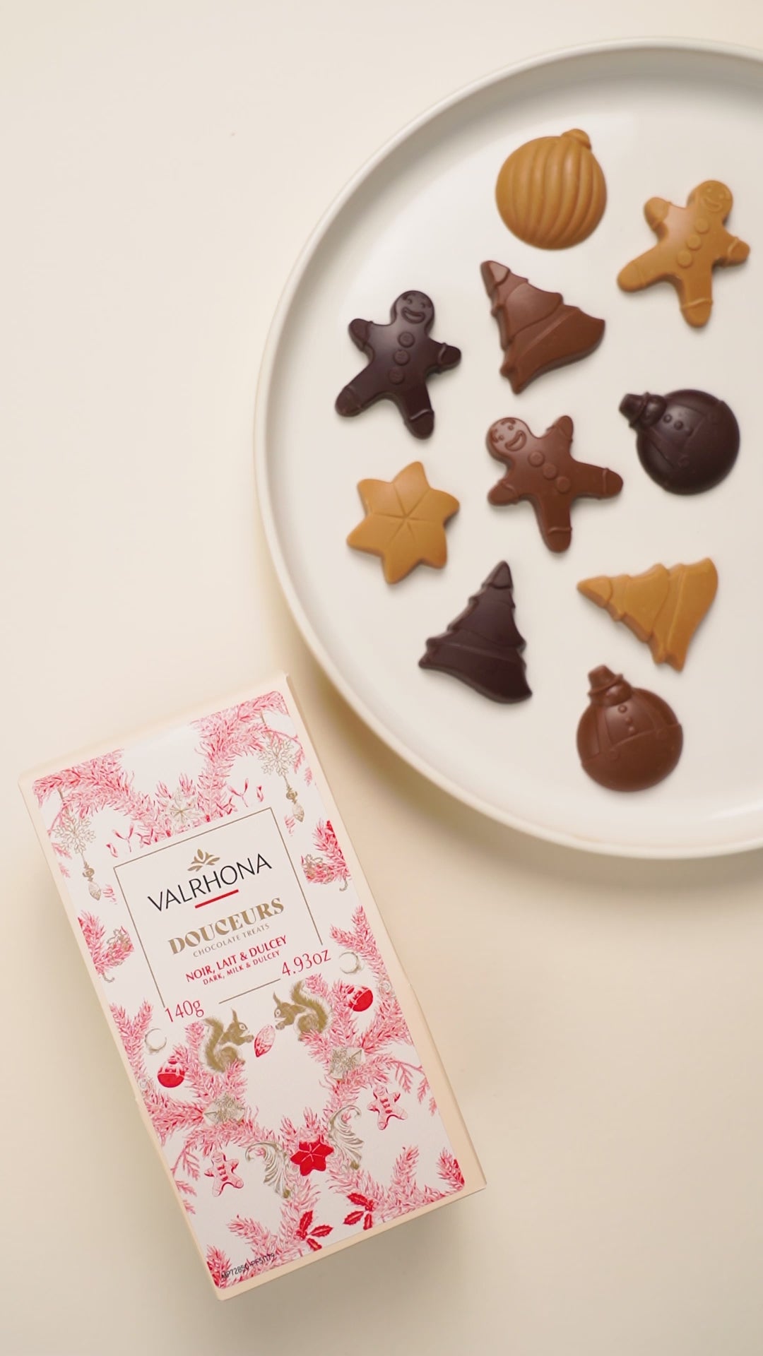 L'étui douceurs de Noël Valrhona est présenté dans un emballage élégant et festif, qui met en valeur les chocolats qu'il contient. Les formes de boules de neige, d'étoiles et de bonhommes de pain d'épices ajoutent une touche de magie et de féerie à ce coffret.